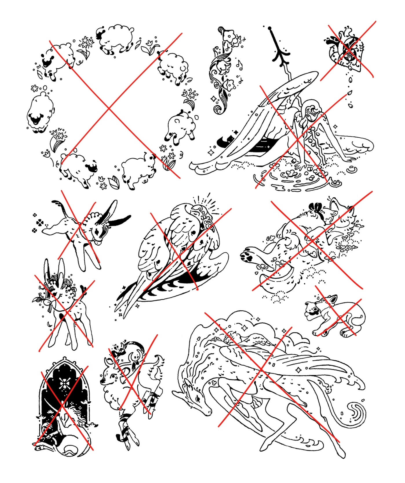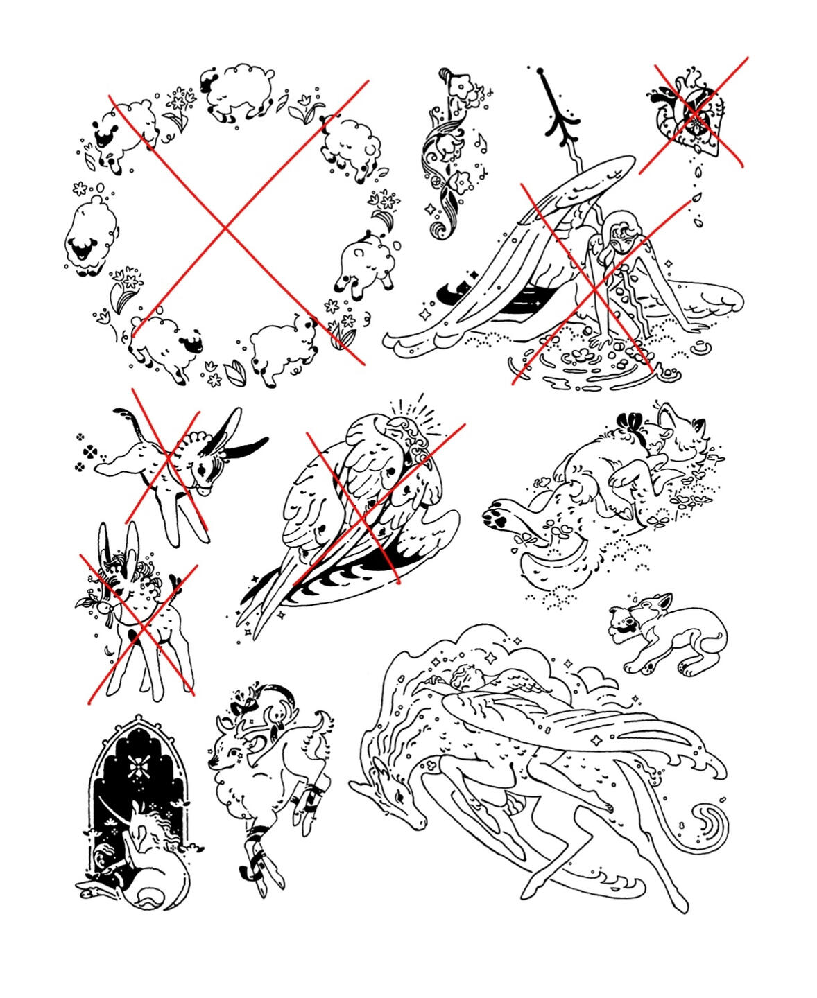 .Either pick the flash(es) you would like to have tattooed (the ones with a cross are already booked) or write a short description of your project.